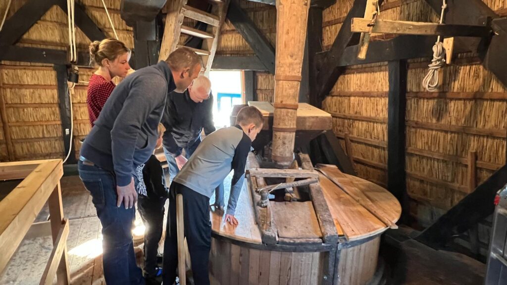 Molenaars Gerard en Roelof leggen uit hoe alles werkt. Ze vertellen over hoe het graan wordt gemalen met behulp van een molensteen, over het in gang zetten van de wieken én het stoppen ervan, maar ook over de geschiedenis van de molen. “De molen stamt uit 1838 en is oorspronkelijk een poldermolen. Hij stond in Zuid-Holland. In 1878 is hij verplaatst naar Zuidwolde. De nieuwe eigenaar heeft ‘m destijds voor 1000 gulden gekocht. Met een schip en paard en wagen is de molen naar Zuidwolde overgebracht.” Dion, Brent en Thomas uit Hollandscheveld luisteren geboeid. “Ze vinden molens heel interessant. En ik ook, want ook ik was nog nooit in een molen geweest”, vertelt hun moeder.
