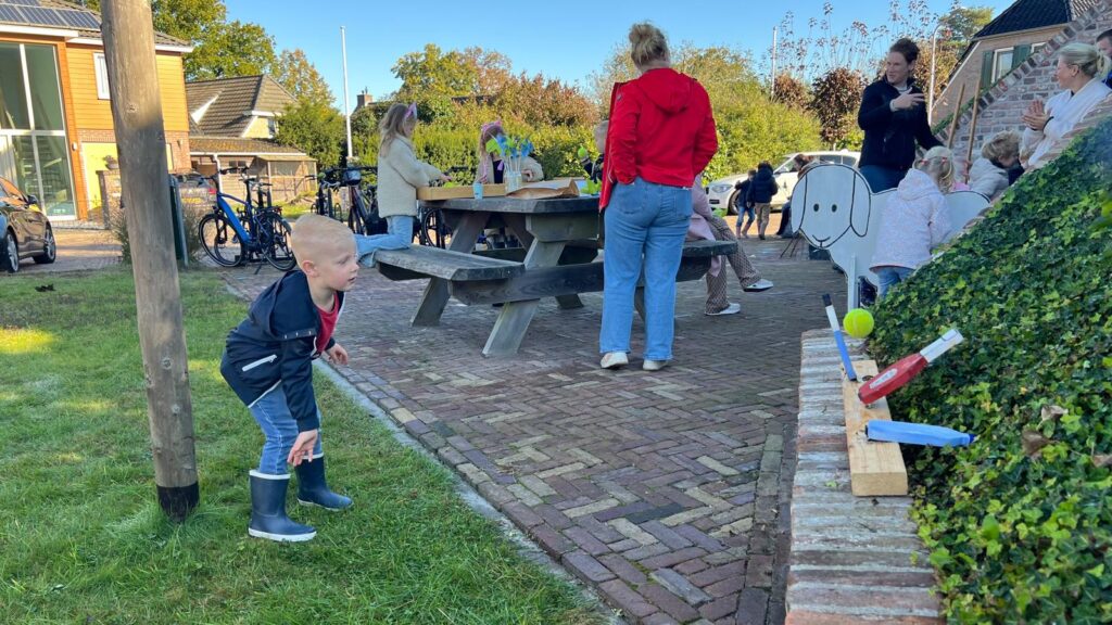 Ook buiten is het druk. Daar kunnen de kinderen meedoen aan allerlei spelletjes, zoals schaapscheren (een houten schaap met een opgeblazen ballon als buik waar scheerschuim op wordt gesmeerd), sjoelen maar dan anders (met tennisballen die in een gat moeten belanden), steltlopen, stoepkrijten en flessengooien. Terwijl de ouders in het zonnetje toekijken vermaken de kinderen zich prima. Het is een geslaagde ochtend.
