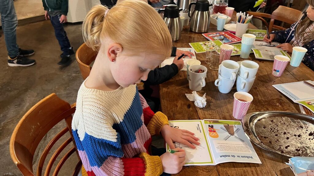 Op de begane grond zit de lange tafel ondertussen helemaal vol. Het zorgt voor een gezellige aanblik. Niet alleen de pannenkoeken en ranja zijn een succesnummer, ook de kleurplaat van een molen blijkt in trek. Het inkleuren wordt serieus aangepakt.