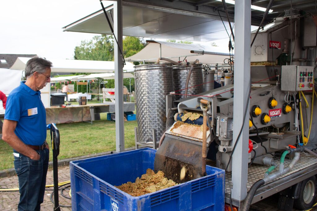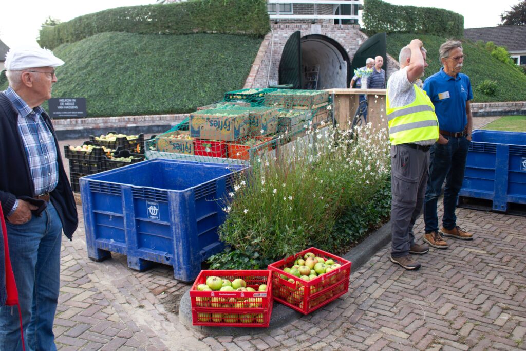 “We verwerken vandaag zo’n 4200 kilo fruit. De een komt met 50 kilo, de ander met 400 kilo”, vertelt Bert Snippe van de Hoogstambrigade. “Het mooiste resultaat krijg je bij een verhouding van 70 procent appels en 30 procent peren. Dan heb je het lekkerste, frisse sap.” Elk jaar staat de fruitpersdag op het programma, maar dit jaar voor het eerst bij de Meule van Wassens. En dat blijkt een uitstekende keuze. “Dit is een schitterende plek, met de draaiende molen op de achtergrond. Precies zoals het hoort: midden in het dorp.”
