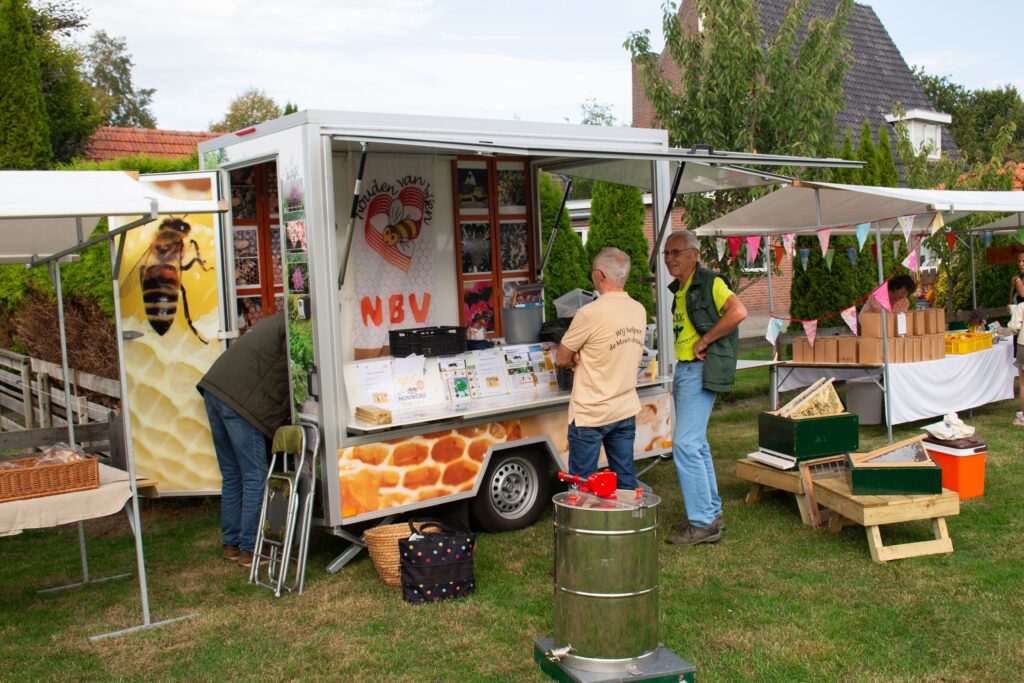 Bij de stand van Imkersvereniging Ruinen & Omstreken vertelt Willem Wobben honderduit over het houden van bijen. Hij houdt een potje honing op de kop. “Kijk, al houd ik het uren op de kop, de honing druipt er niet uit. Dan weet je dat het om echte heidehoning gaat.” Wobben heeft het naar zijn zin. “Het is een leuke markt. Dit soort kleinschalige evenementen zouden er veel meer moeten zijn.”
