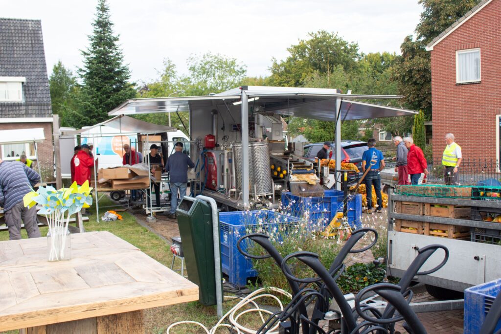 Al in de vroege ochtend rijden auto’s met aanhangers af en aan. Kisten vol appels – en hier en daar wat peren – worden uitgeladen, klaar voor de mobiele fruitpers. Binnen korte tijd draait de installatie op volle toeren, onder flink wat belangstelling. Vrijwilligers van de Hoogstambrigade De Wolden vullen zakken en pakken met het verse sap, dat door de fruiteigenaren weer tevreden wordt ingeladen.