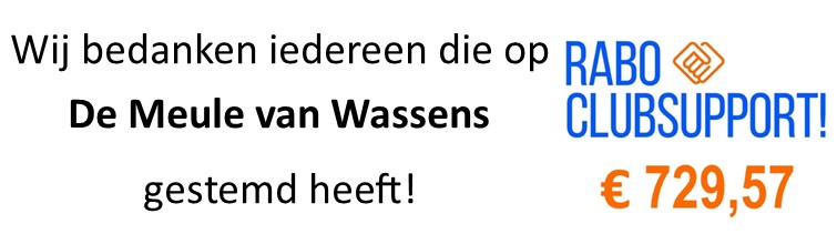 De stemactie van Rabo ClubSupport heeft 729,57 euro opgeleverd voor Stichting De Meule van Wassens. Een prachtig bedrag. Iedereen bedankt voor het stemmen op onze mooie molen!
